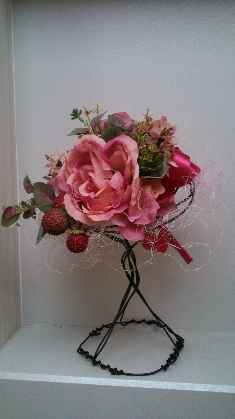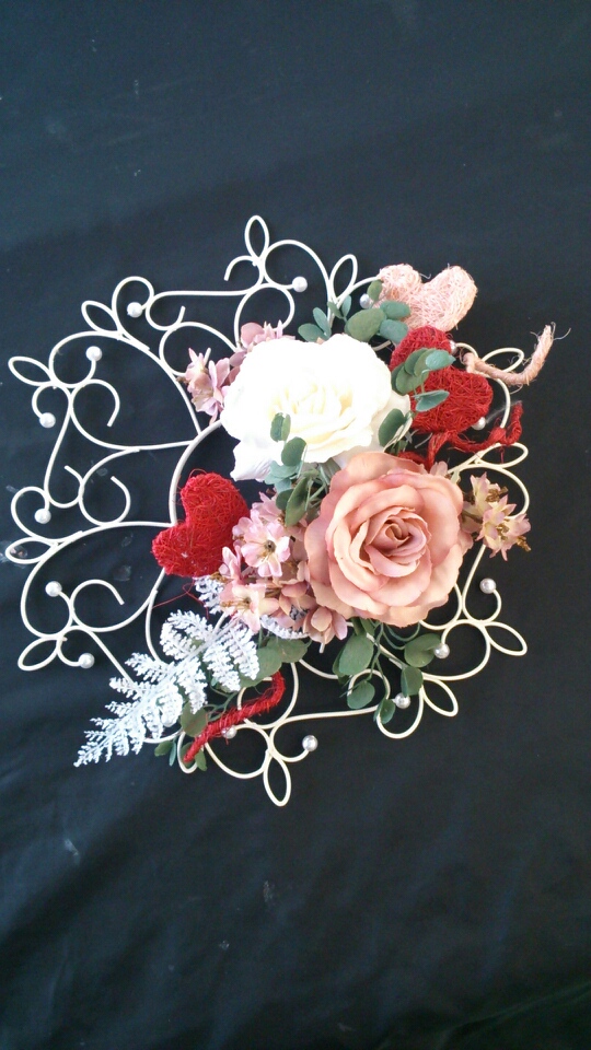 白のワイヤーリースに、ブリブリに可愛いハート付きのアレンジ♪
