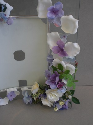 ミラーにお花をアレンジします。(サンプルなので、簡単に束ねてある状態です)