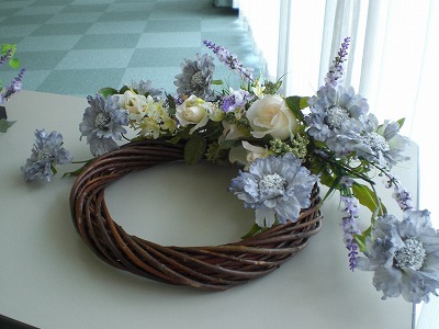 今月はスカビオサのリース。ラベンダーやバラなども入ったアレンジです。